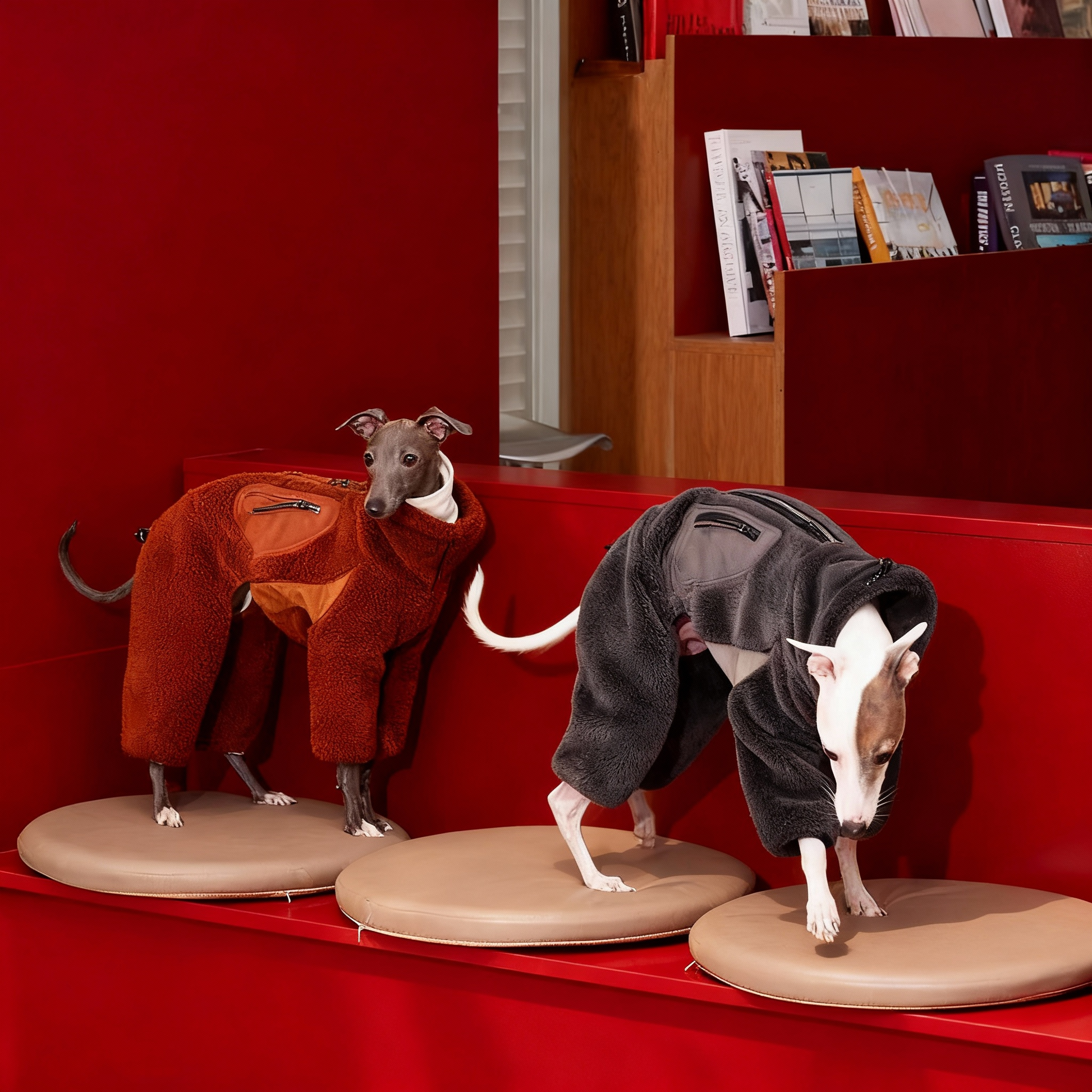 This Luxury Fleece Tech Jumpsuit blends plush winter comfort with elevated designer detailing—crafted for sleek breeds like Greyhounds, Whippets, and Italian Greyhounds who need warmth without bulk.